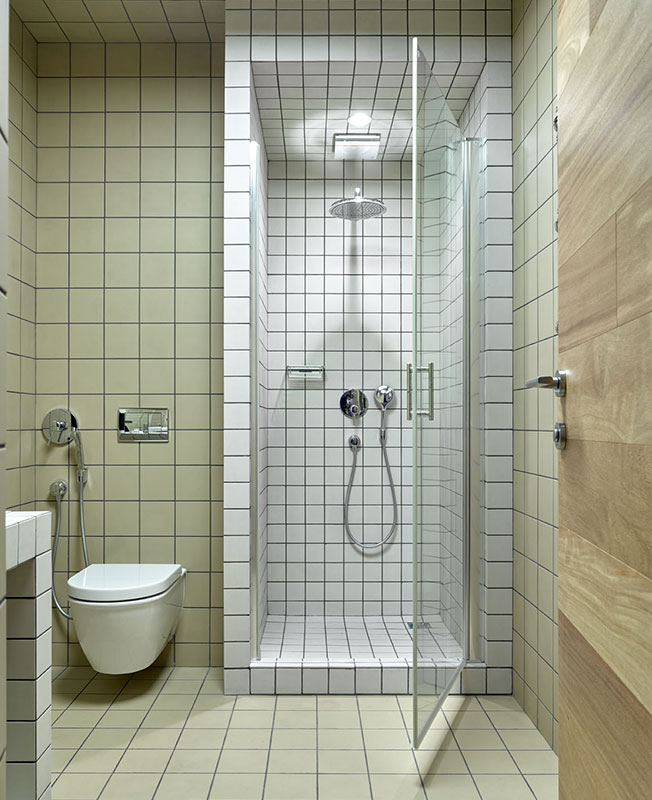 Санузел отделан предельно лаконично. Тем не менее, умело поиграв оттенками и форматами керамической плитки, архитекторы добились впечатляющего эффекта.