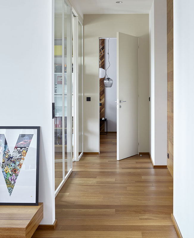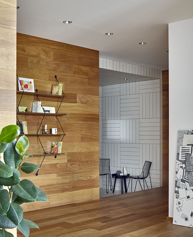 Интерьер не обременен деталями и декором, но богат на изобретательные находки. Архитекторам удалось создать вау-эффект, не прибегая к ярким краскам и сложным формам. Они развивали свой любимый прием «куб в кубе»: покрытие пола продолжается на стенах, а то и на потолке, отчего возникают эффектные, обволакивающие пространства-шкатулки. Самый впечатляющий пример — белая, разлинованная черным прихожая. А в спальне стена в изголовье отделана деревянными плашками, уложенными елочкой, как обычно кладут паркет на полу. Таким образом авторы выполнили запрос заказчиков на обилие дерева, в то же время избежали ощущения переизбытка этого материала.