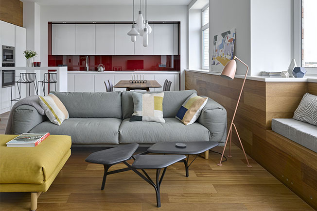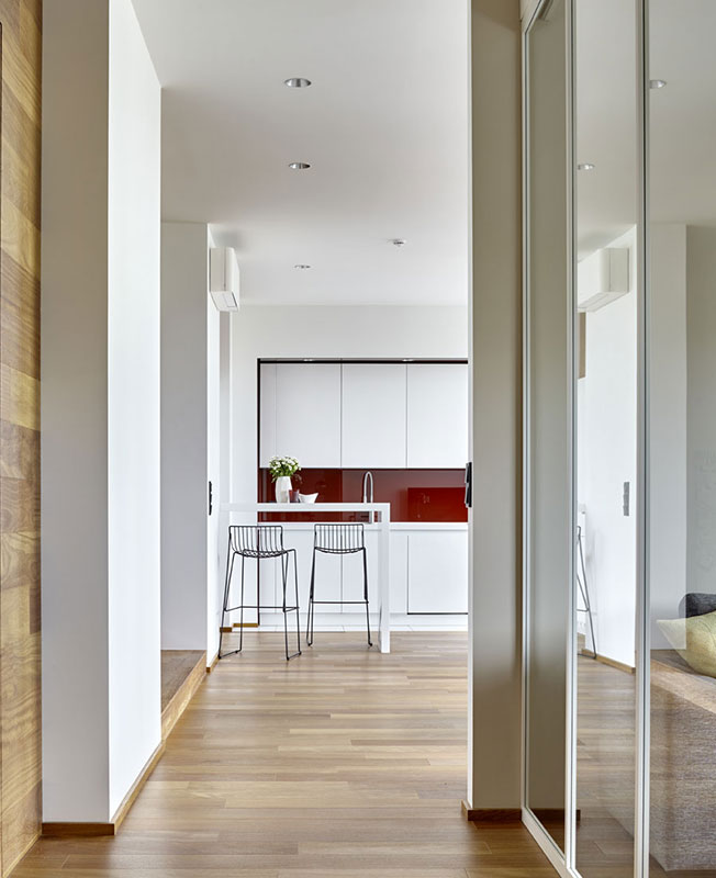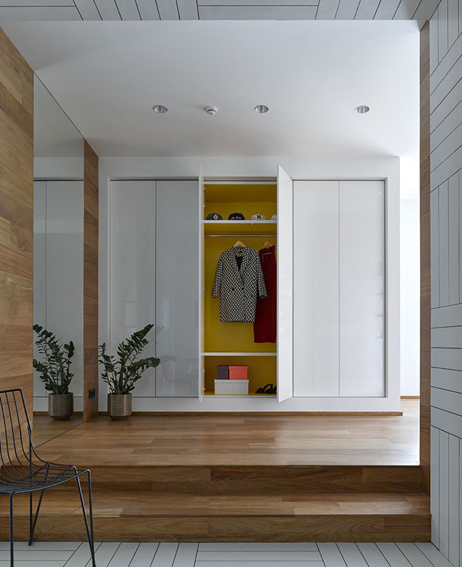 Цветовые акценты появляются в неожиданных местах, например в «подкладке» гардероба. Подиум отделяет гостиную от прихожей.