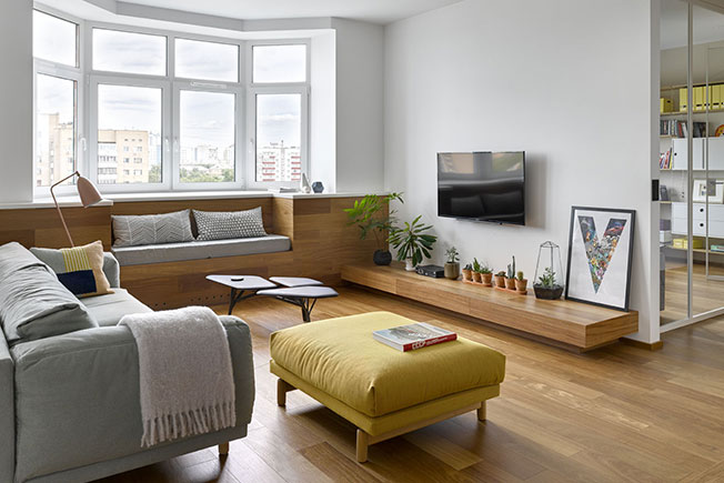 Гостиная. Батареи закрыты экранами, выполненными из того же дерева, что и пол, в нише под подоконником устроен удобный диванчик. Диван и пуф Muuto, торшер Gubi, кофейный столик La Chance.