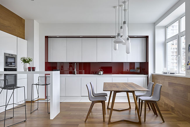 Кухонный фартук из стекла, выкрашенного в сочный винный оттенок — один из редких цветовых акцентов в квартире. Обеденный стол и стулья от немецкого бренда Zeitraum. Над столом светильники Design House Stockholm.