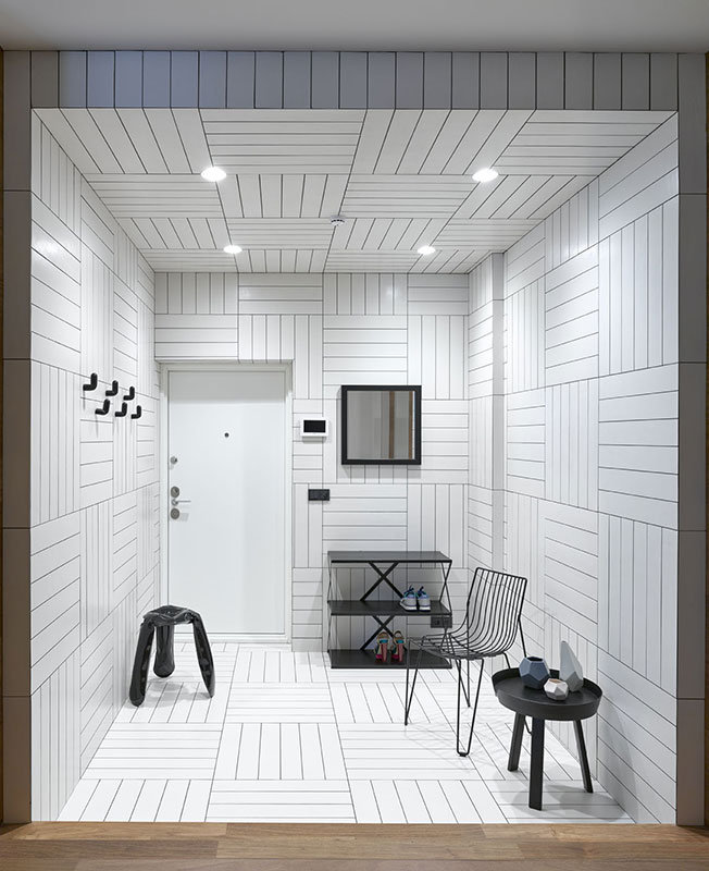 Прихожая. На разлинованных белых поверхностях выделяются контрастные черные предметы: столик Muuto, табурет Hay, крючки для одежды Established & Sons, стеллаж One Nordic.