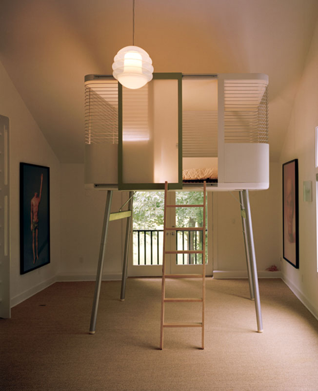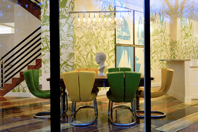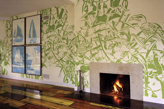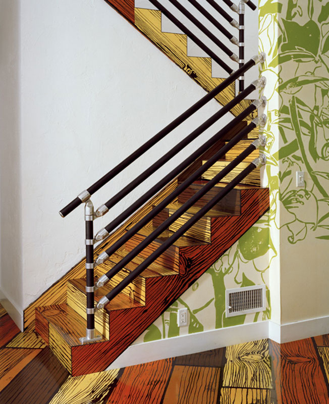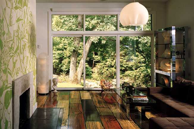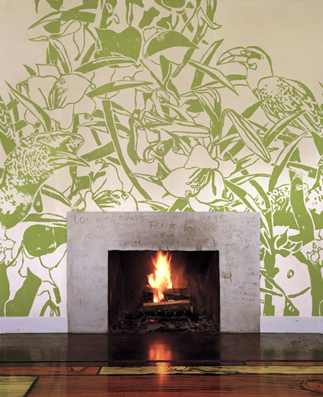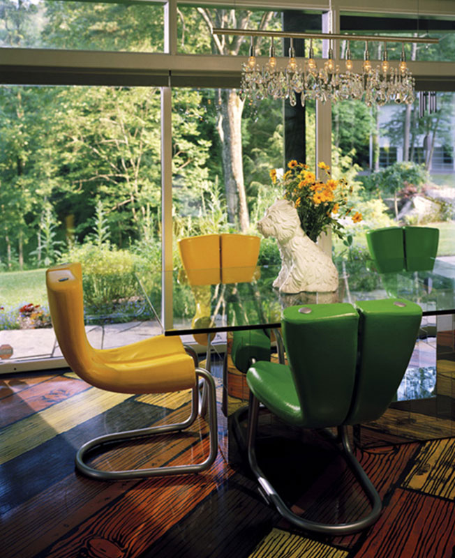 Когда Линдеман впервые увидел этот дом, единственной мыслью было: «Сносить!» Он купил его только из-за 25-акрового участка. Но потом вспомнил выставку Ричарда Вудса в нью-йоркской Deitch Projects: тогда художник расписал фасады галереи под фахверк, стены выглядели неожиданно свежо и смело. Линдеман подумал, что подобный узор будет неплохо смотреться в живописном ландшафте. Пригласил Вудса, и тот покрыл фахверковой росписью внешние стены. А кроме того, разукрасил стену и полы в большой зале, которая объединяет кухню-гостиную-столовую. В эту оболочку хозяин поместил модные образцы дизайна. И разрешил детям похулиганить с каминным обрамлением: их незамысловатые граффити завершили образ богемного дома.