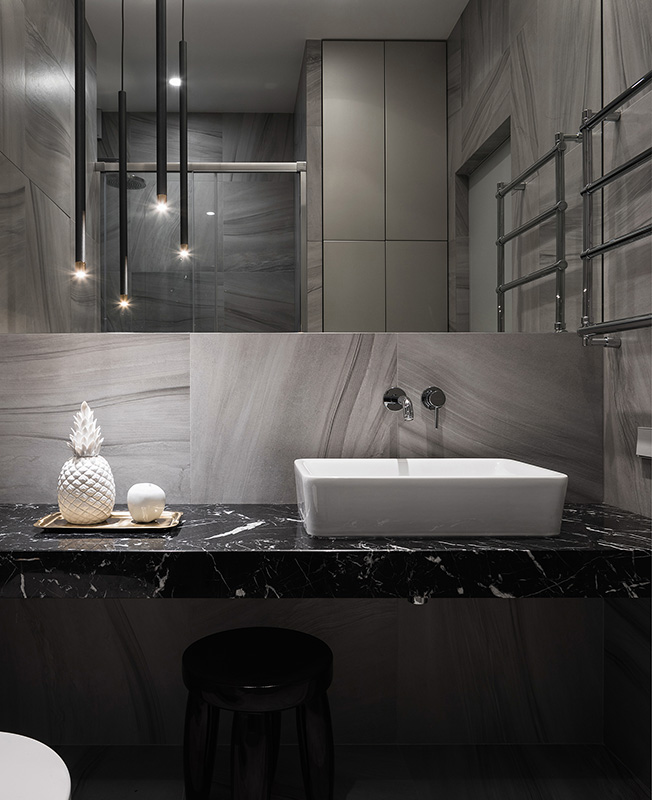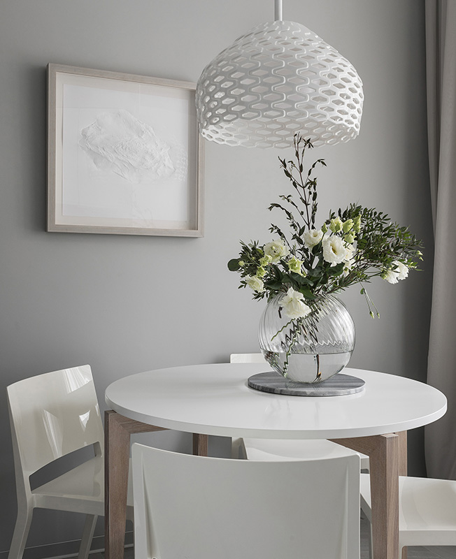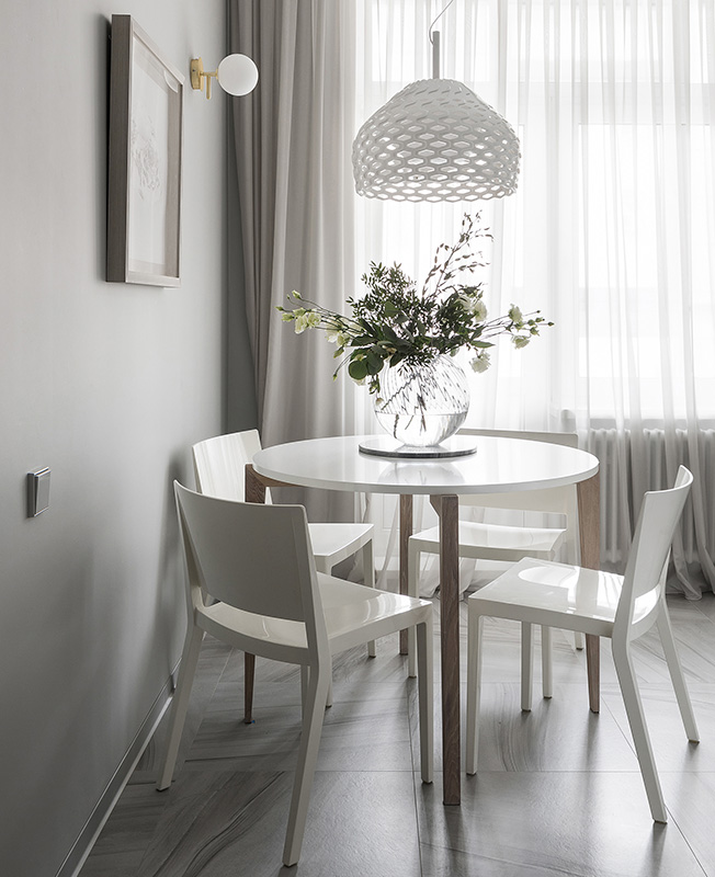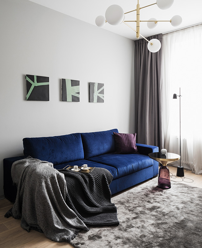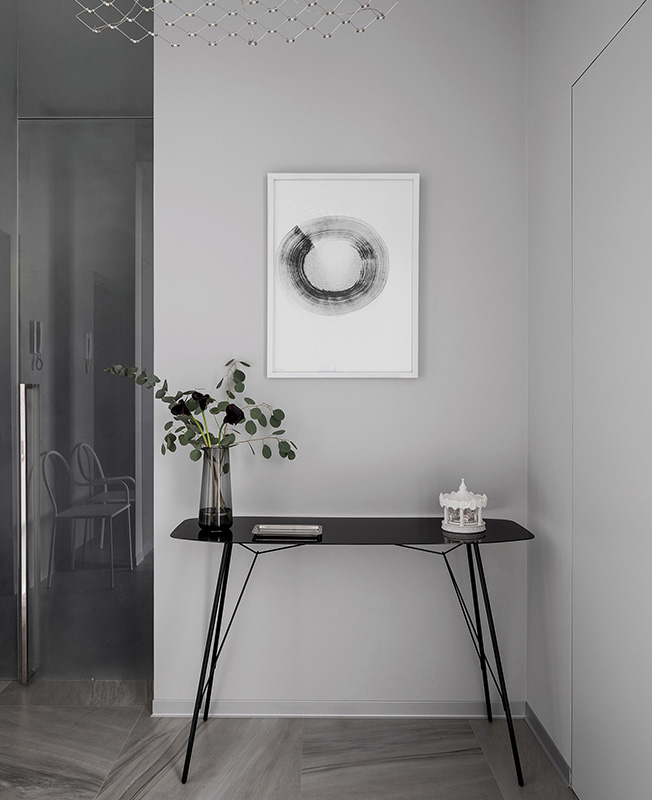 «Заказчица попросила подобрать для стен красивый оттенок серого цвета, — комментирует архитектор. — Чтобы интерьер не был совсем монохромным я внес несколько ярких акцентов: это синий диван, стеклянные журнальные столики, бордовый комод и цветовой акцент на стенах — работы художника Штефана Шпихера. Кухня, наоборот, сдержанно-холодная за счет белых фасадов».