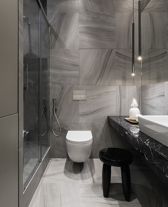 От зоны гостиной гардеробную отделили перегородками из белого матового стекла, как и зону хранения в прихожей. Самые большие изменения в планировке коснулись санузла: вместо ванны появилась душевая кабина, за счет чего хватило места для встроенного шкафа для бытовых принадлежностей и стиральной машины.