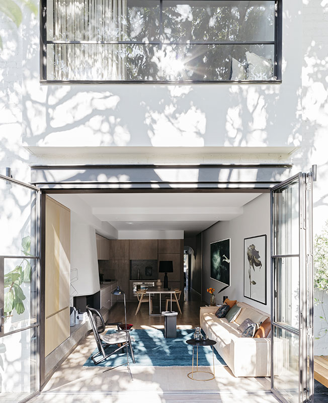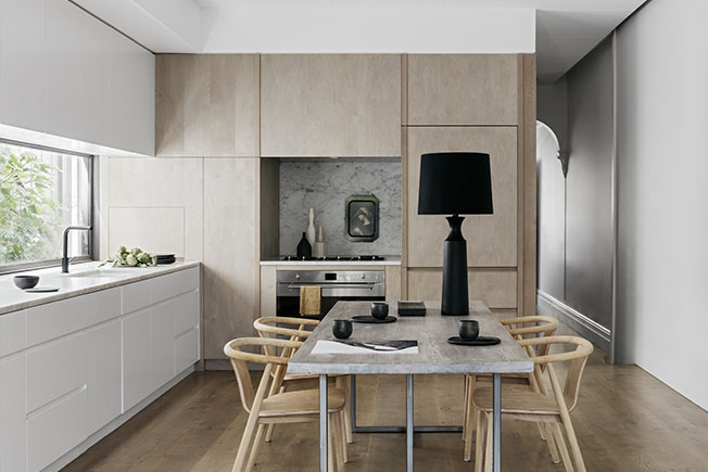 Деревянные досчатые полы гармонируют с окрашенными потолками. На этом деликатном фоне эффектно выделены темные двери со стальными рамами и металлический декор в виде посуды и светильников. «Окончательный проект имеет элегантный и слегка женственный образ, это красиво и тщательно продуманный городской семейный дом».