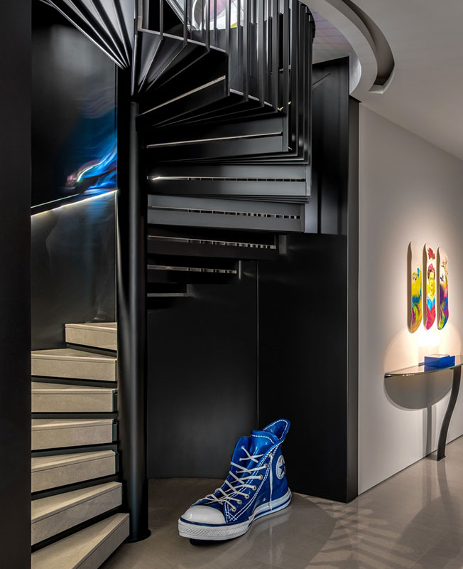 Нижний уровень отвели под приватные зоны — спальни с постельным бельем Flou, семейную гостиную с диваном Minotti и кушеткой Poltrona Frau, современную кухню Alno. Тут же расположена основная ванная комната со стеклянной ванной Palazzani Avi и смесителем Fantini. Уровни соединяет винтовая лестница, обнесенная эффектной решеткой.