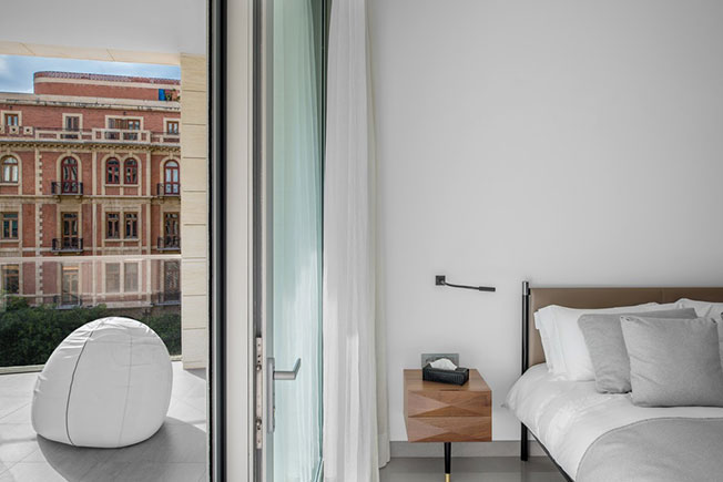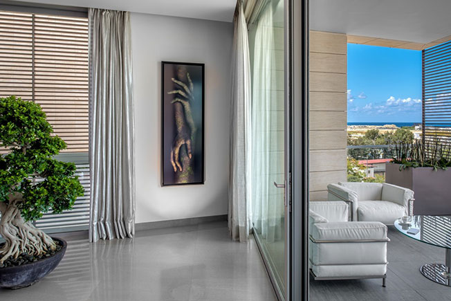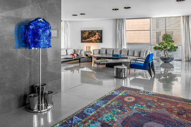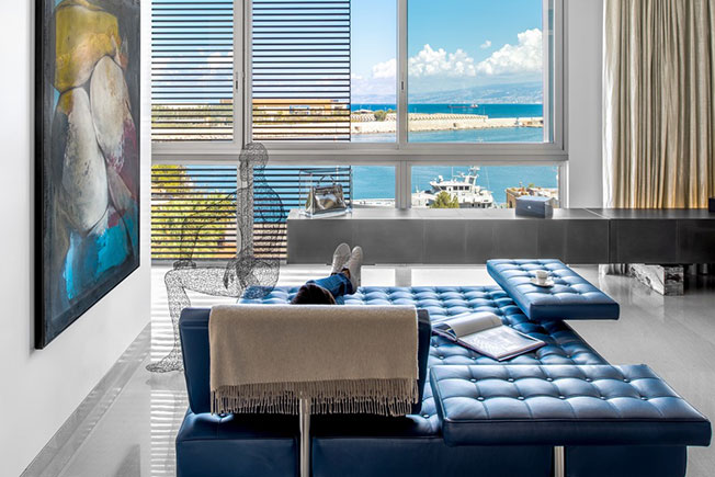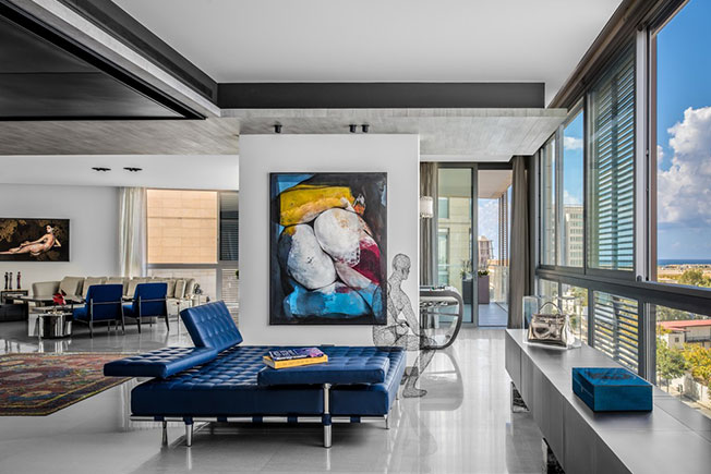 Благодаря удачному расположению дома из окон квартиры открываются виды на Средиземное море и античные руины римского периода с одной стороны и на пестрые городские улицы — с другой. Этот контраст отразили и в интерьере: приглушенную и монотонную палитру строгой архитектуры разбавили всполохи ярких красок — тщательно подобранные арт-объекты, эклектичная мебель и аксессуары.