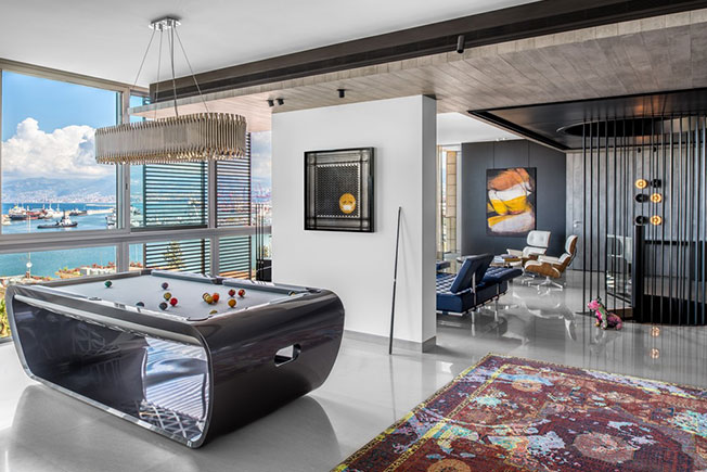 Пространство разделено на две части, отличающиеся по атмосфере. На верхнем уровне расположены общественные зоны, предназначенные для отдыха, общения и развлечений. Здесь нашлось место для сигарного лаунджа, бара и игровой комнаты с бильярдным столом Toulet и настольным футболом Teckell.