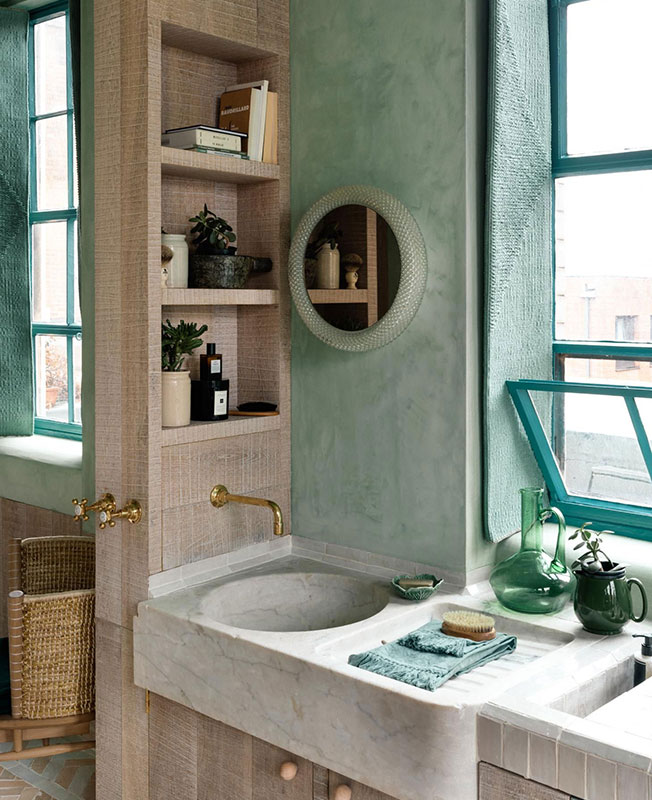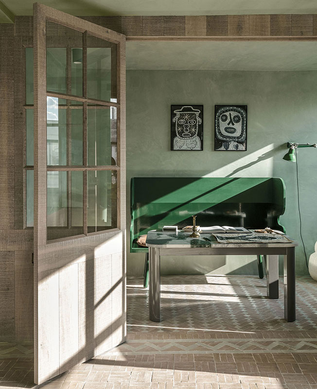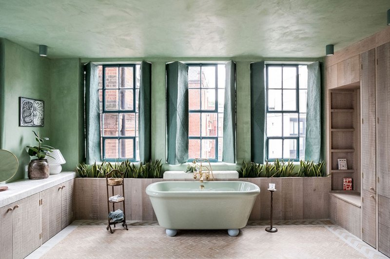 Основная жилая зона создана вдоль ряда оригинальных окон. Мягкие зеленые тона отштукатуренных стен перекликаются с оттенками верхушек деревьев на соседней у церкви Святого Леонарда.