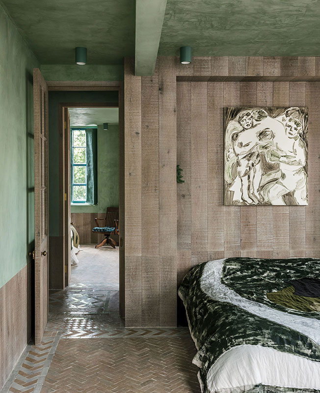 Льняные ставни были разработаны вместе с текстильным дизайнером Кристабель Бальфур и созданы на ее ткацком станке. В гостиной — стулья Zyklus, перетянутые бархатом Pierre Frey, и плетеный стул Brodgar chair. В спальне — покрывало Once Milano по дизайну Фэй Тугуд, украшенное языческими символами, а также нежно-зеленая ванна Water Monopoly. В интерьере использовали синие кружки ручной работы и расписанную вручную посуду керамиста Кристофера Магаршака, стеклянные текстурированные кувшины Йохана Хольца, The New Craftsmen. На стенах — серия картин Стивена Райта, вдохновленная сверхъестественным.