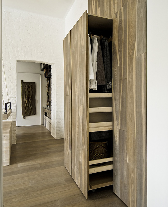 Для каждой вещи предусмотрено специальное место, куда оно убирается, не нарушая гармонии пространства. Например, шкаф с гладким монолитным фасадом скрывает внутри гостевое спальное место. А из кухонного острова выдвигается столик для завтраков.
