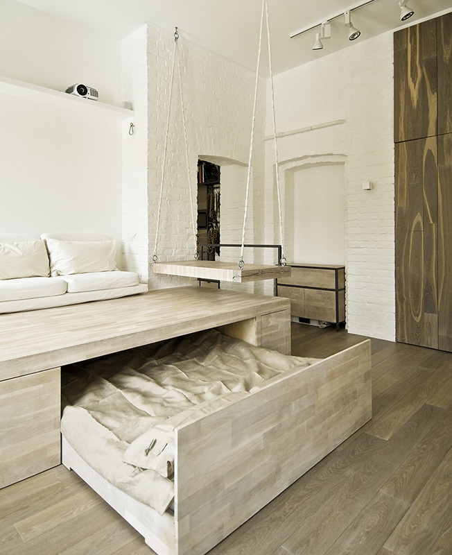 Главное место в зоне гостиной занимает подиум — с низким диваном, подвешенными к потолку качелями и гамаком. Здесь можно отдыхать и принимать гостей и заказчиков, которые приходят за украшениями. Ночью же комната превращается в спальню — стоит приложить магнит к точке в основании подиума, как из-под него выдвигается кровать.