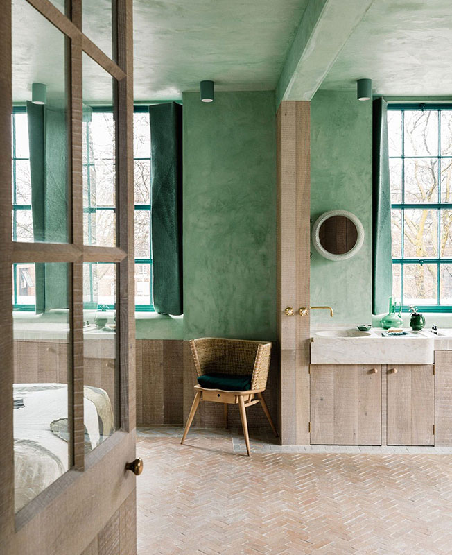 Основная жилая зона создана вдоль ряда оригинальных окон. Мягкие зеленые тона отштукатуренных стен перекликаются с оттенками верхушек деревьев на соседней площади у церкви Святого Леонарда.