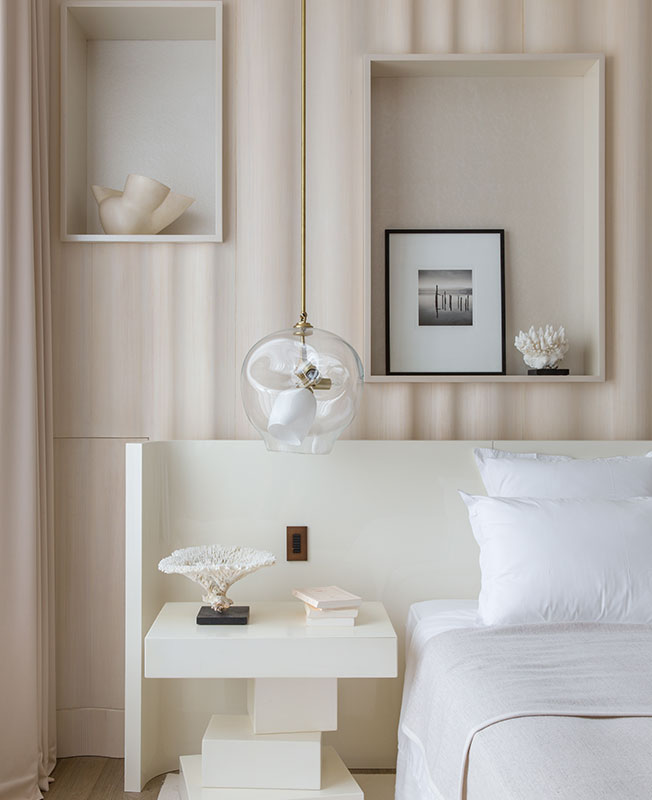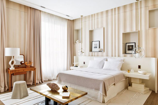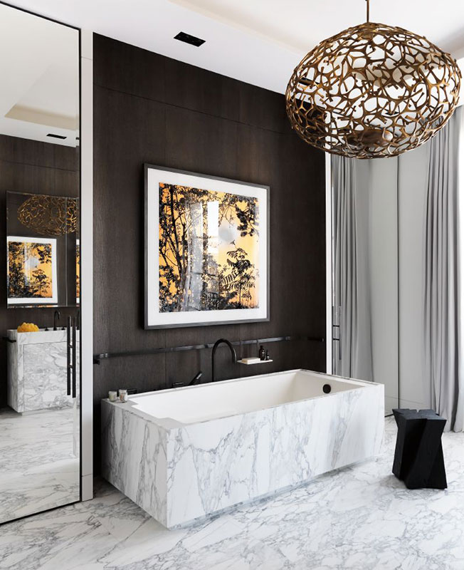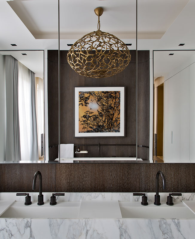 Концепция новой простоты требует особого отношения к материалам. И в этом у Дамьена мало конкурентов. Он не боялся быть неоригинальным — ванна из мрамора сорта арабеската давно стала общим местом дорогих проектов. Но он же придумал в спальне «волнистую ель» — деревянные панели, рельеф которых получен методом пескоструйной обработки.