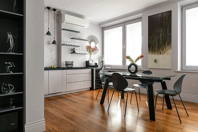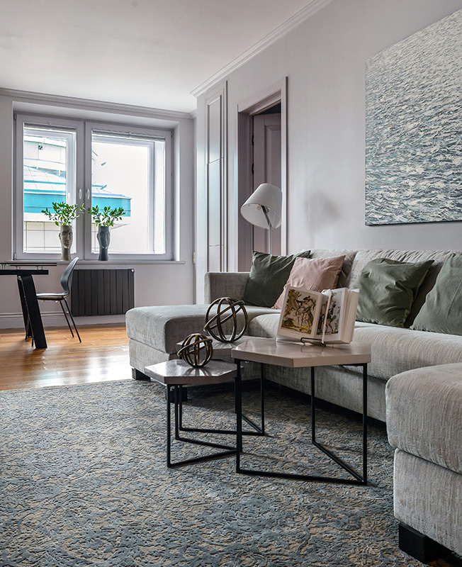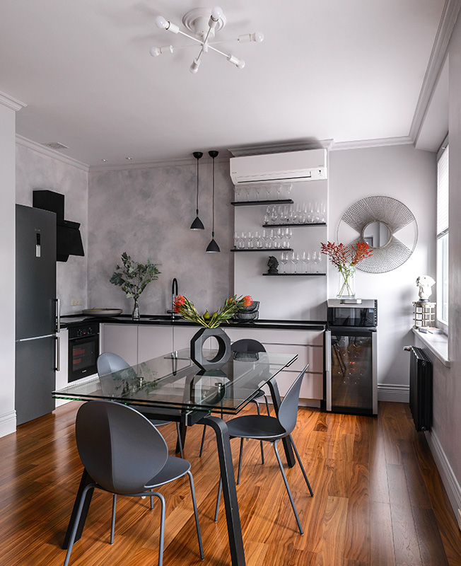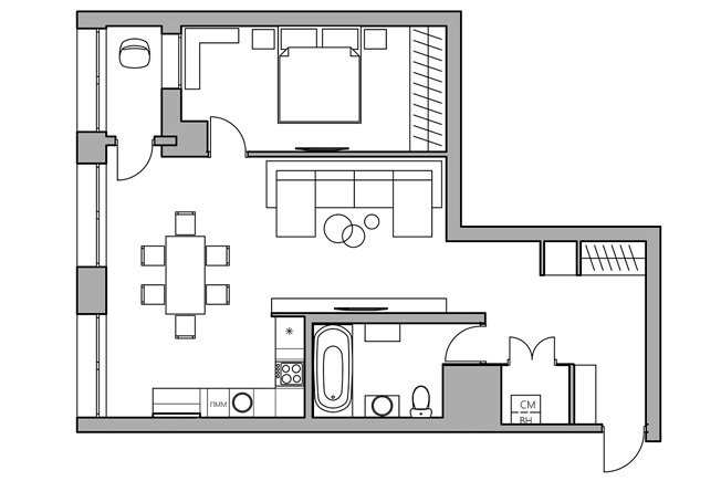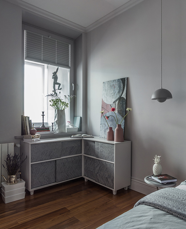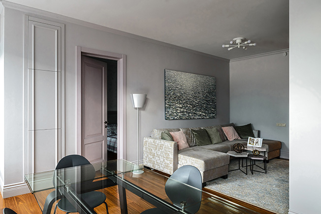 Квартира — вторичное жилье в доме 2003 года постройки. При ремонте решили обойтись без существенной перепланировки, но добавить функциональности: для стиральной машины, водонагревателя и бытовых принадлежностей возвели «хозяйственную комнату». Жилое пространство разделили на общественную и приватную зоны. Первая представляет собой объединенное пространство гостиной-столовой-кухни, вторая — обособленную спальню площадью 12 кв. метров.