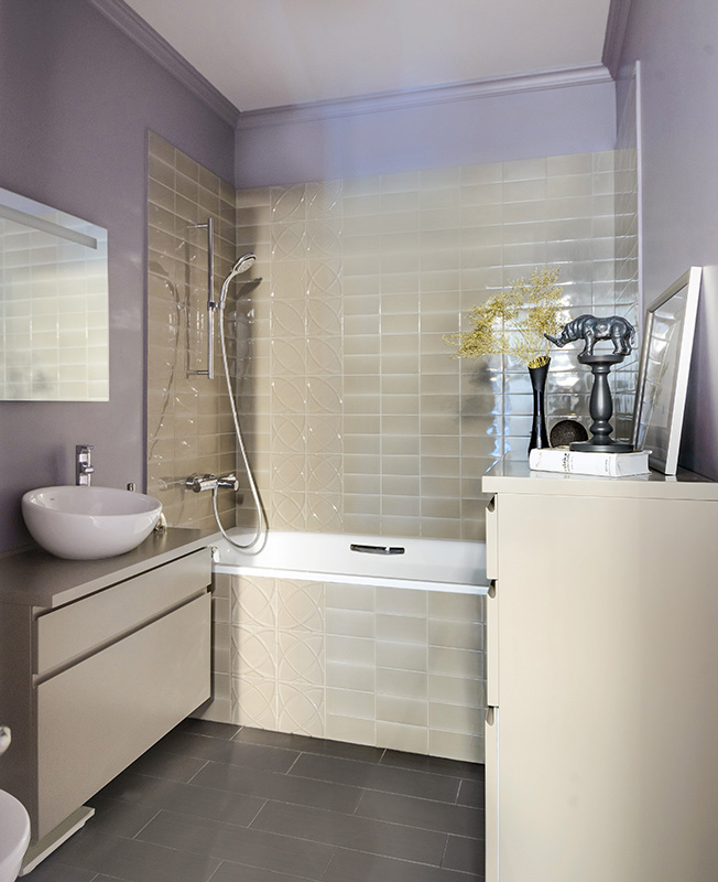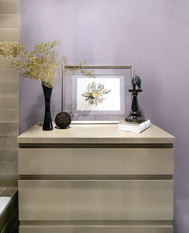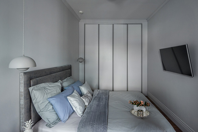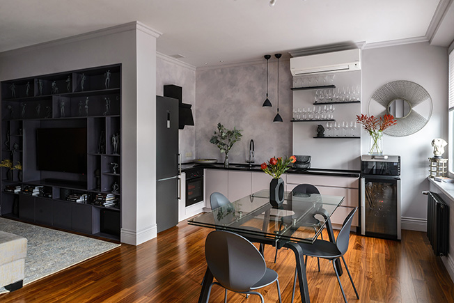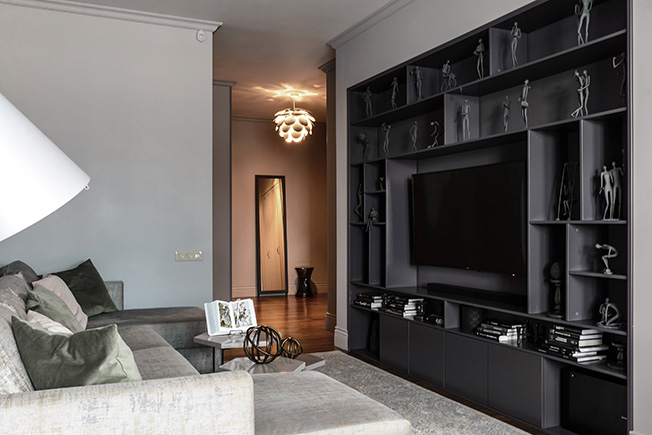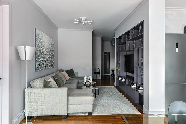 «Чтобы расширить небольшое по площади пространство, зоны хранения замаскированы — встроенные шкафы покрашены в тон стенам, полы представляют собой единое целое, а компактная кухня сделана без верхних шкафов. «Растворить» в пространстве небольшой гостиной крупный телевизор помогает встроенный в нишу стеллаж темно-черничного цвета.