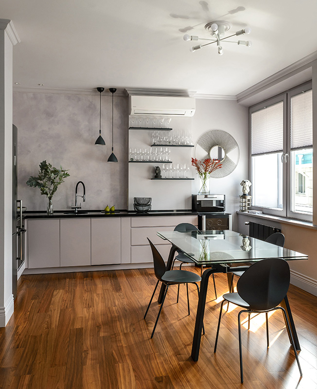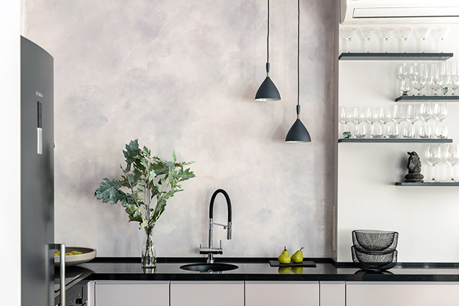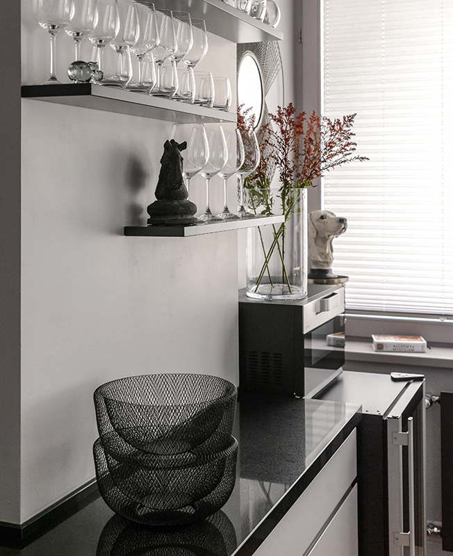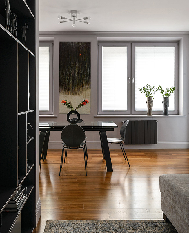 Стены, потолки, плинтусы и дверцы шкафов окрашены английской краской пяти серых оттенков с легким розоватым подтоном — его красиво подчеркивает закатное солнце, поскольку окна ориентированы на юго-запад. Черный цвет радиаторов, подстолья, стульев, полок и столешницы задает ритм и скрепляет интерьер, не дает ему «растечься» гуляющими полутонами.