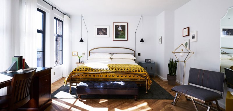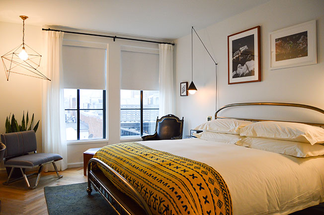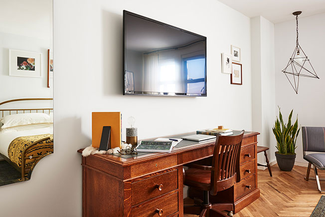 Стены остались белыми, что не отвлекает от эклектичной меблировки. Полы — паркетные с раскладкой шевроном. В каждом номере стоит кровать с латунным корпусом и крепкий дубовый письменный стол. Есть здесь и книжные стеллажи, заполненные изданиями из магазина Idle Times Books. Line DC также может похвастаться тренажерным залом, просторной крышей и собственной радиостанцией.