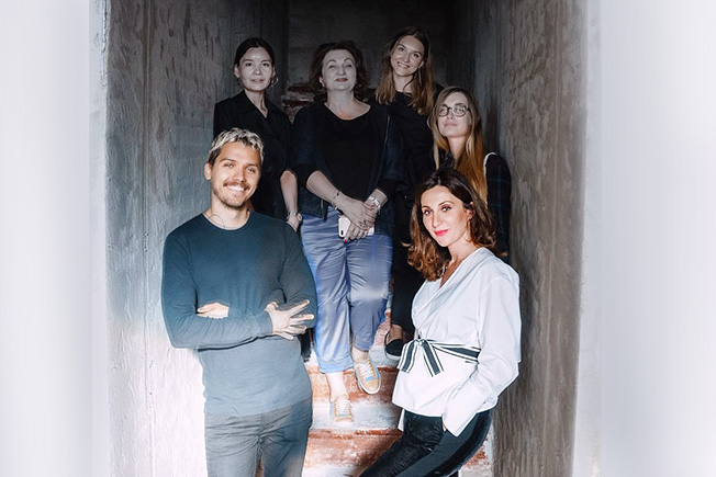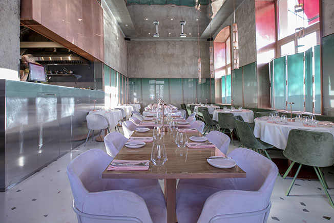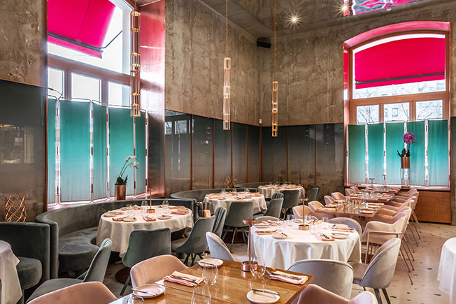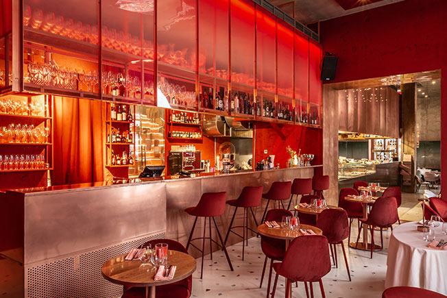 Ресторан разделен на две зоны. Бар оформлен в интенсивных красных тонах с эффектной визуальной доминантой — объемной пятиконечной звездой. Насыщенная цветовая палитра плавно переходит в пастельные зеленые и розовые оттенки с эффектом градиента. Обе зоны объединяет латунь — материал использован для оформления барной стойки, фасадов открытой кухни, мебели, аксессуаров и светильников.