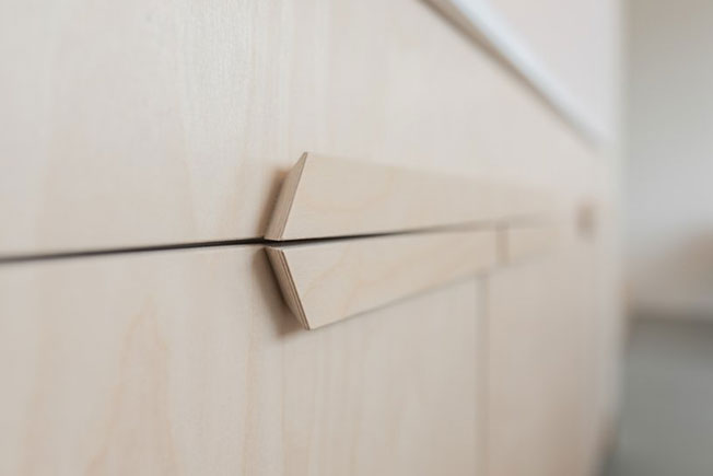 Всю корпусную мебель и системы хранения архитектор проектировал по месту. Санузел находится за кухней. Зона гостиной приподнята на подиум (в нем скрыта дополнительная кровать для гостей), для того, чтобы отделить ее от зоны столовой, которая находится непосредственно у окна. Вместо штор — жалюзи.