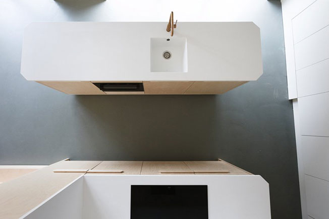 Архитекторы использовали высокие потолки (3,5 м), чтобы разместить кровать над кухней. Спальню подняли на высокую платформу, куда можно подняться по красивым визуально легким ступенькам.