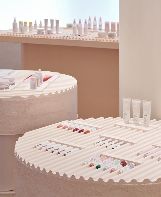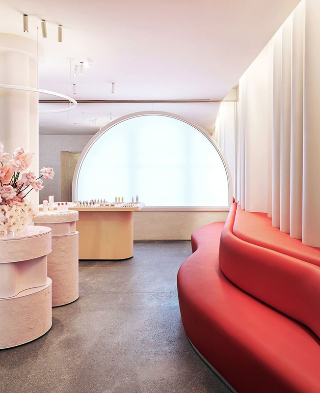 Красный ковер приводит посетителей к лестнице, заключенной в мягкие, отштукатуренные стены, светящиеся ореолом света. Cреди плавных округлых контуров диванов расставлены скульптурные стулья 25-летнего постмодерниста Томаса Баргера и рифленые цоколи для косметических товаров.. Это художественная галерея? Спа? Нет, пример коммерческого пространства в тренде «эмоциональной торговли». Онлайн-покупки синхронизируются здесь с офлайн-покупками, то есть клиенты могут начинать заказы в магазине, а затем заканчивать их онлайн.
