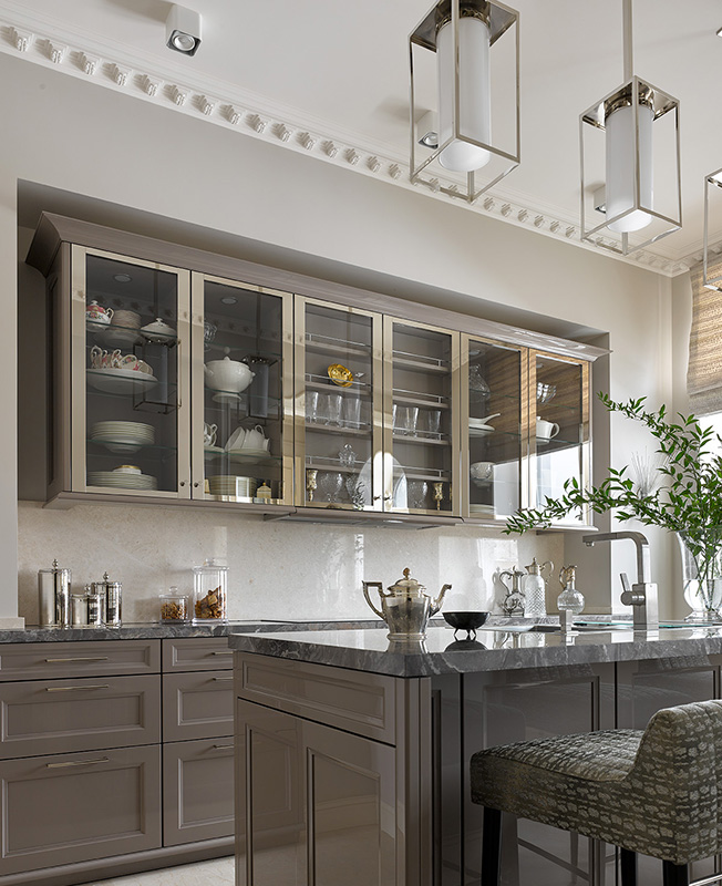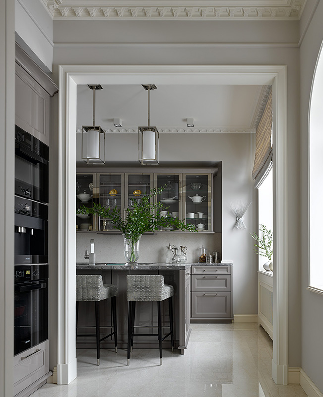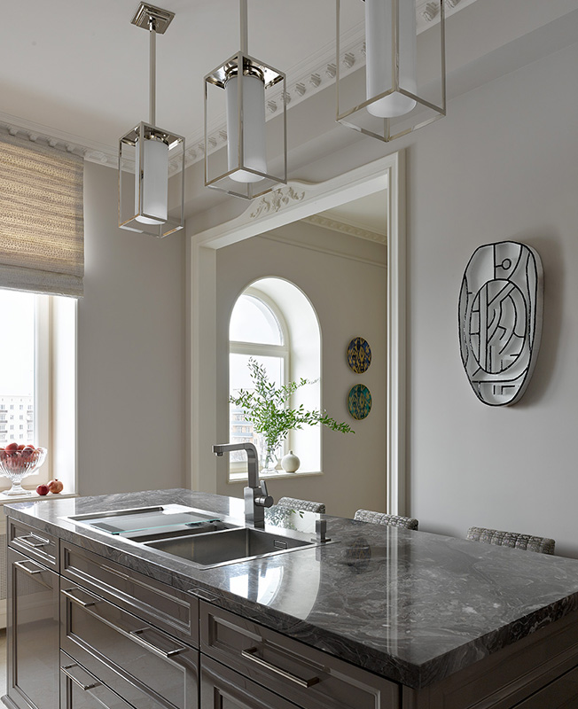 Кухня. Мебель Siematic. Стулья Munna (ткань S. Harris, «КАДО»). Столешница из мрамора Bosco del Fiori. Подвесные светильники Visual Comfort. Римская штора Lizzo.