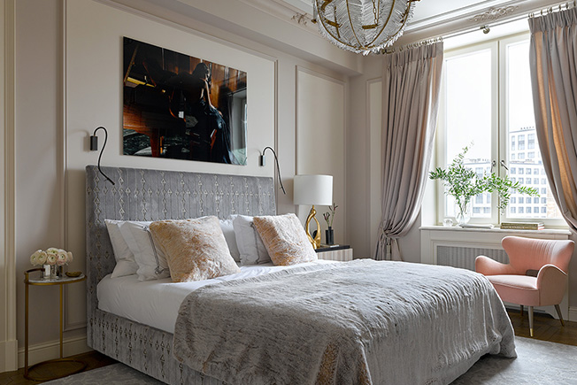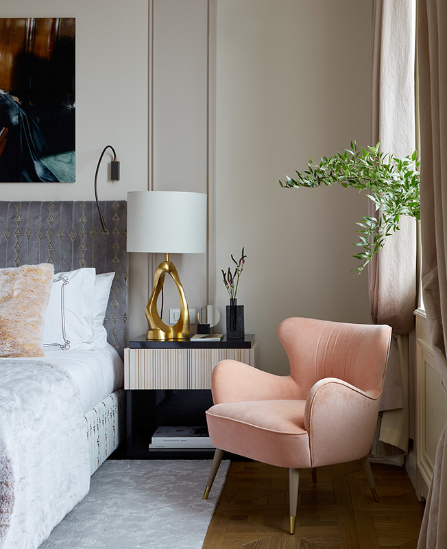 Спальня хозяев. Кровать LoffiLab, изготовлена по эскизам дизайнеров. Кресло Munna. Светильник Visual Comfort. Ковер Safavieh. На стенах краска Zoffany, Manders. Фото над кроватью — Джанлука Фонтана (Gianluca Fontana), галерея Lumas.