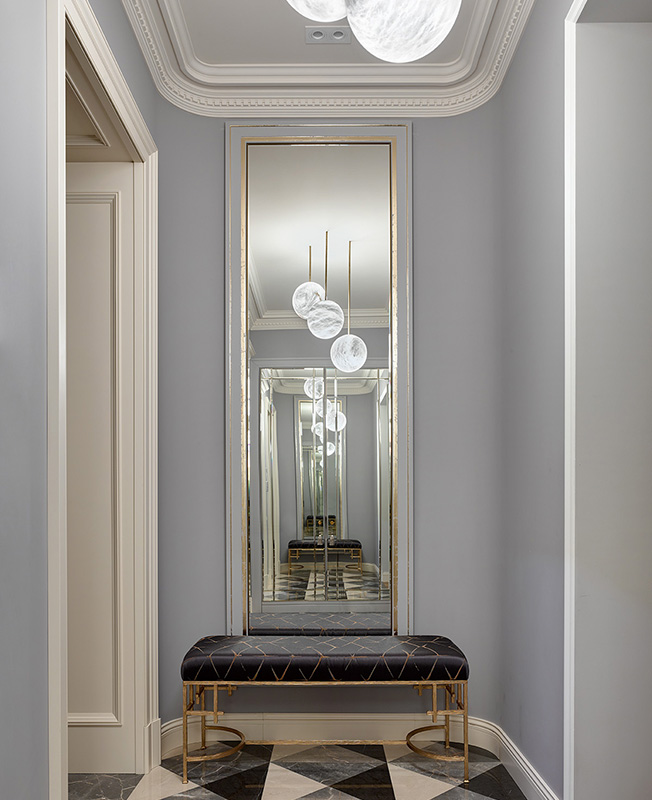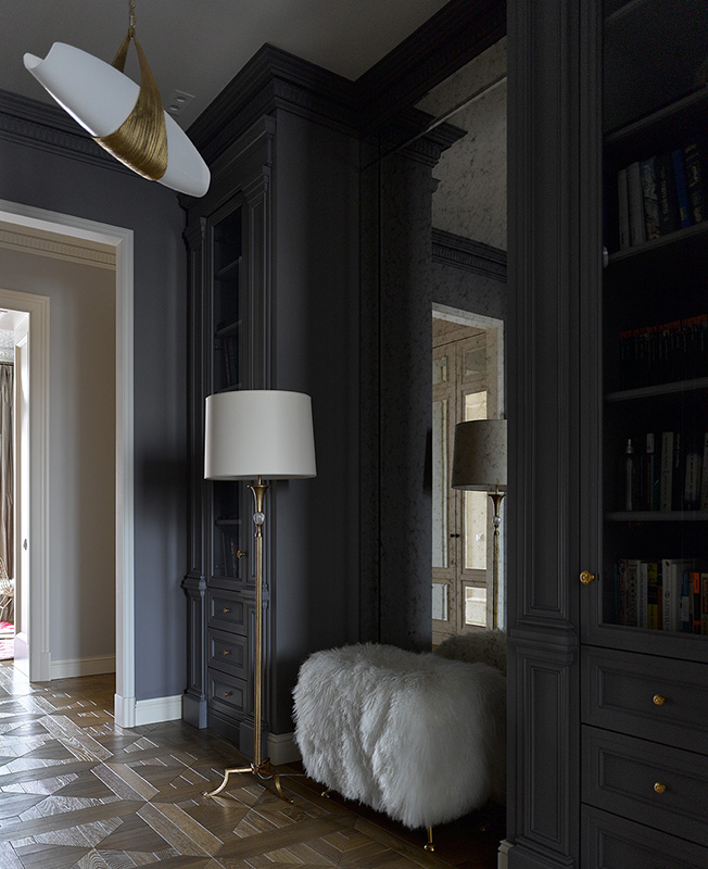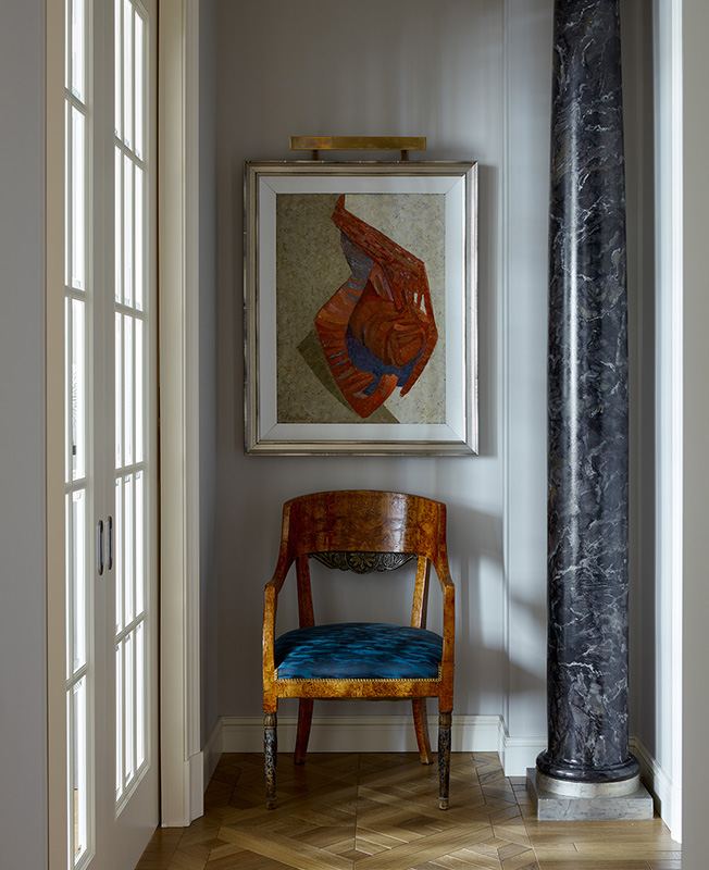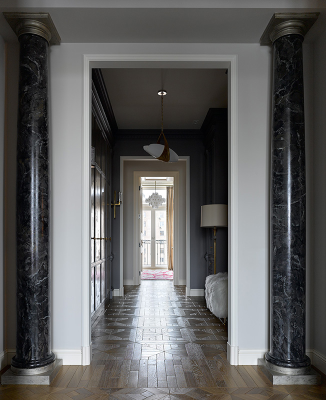 Коридор, соединяющий общественную и приватную части квартиры. Слева — гардеробная. Справа — книжные шкафы. Колонны — гипс, мастерская «Петергоф»; ручная роспись под мрамор, Алена Вилюкова. Потолочный светильник и бра Visual Comfort, диз. Келли Уэстлер. Полы из массива дуба.