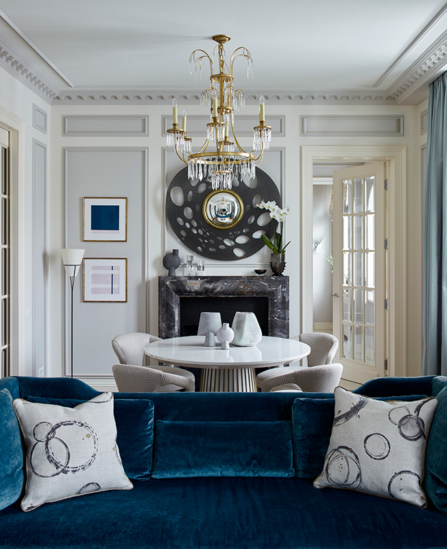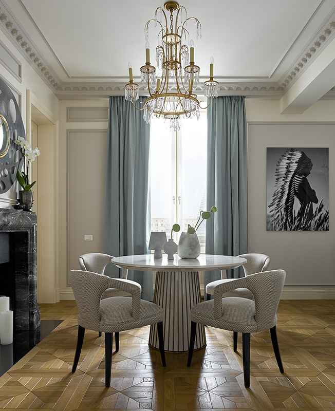 Зона столовой. Обеденный стол Frato. Стулья Munna. Вазы на столе 101 Copenhagen, галерея «Альта Гамма». Винтажная ваза из Испании. Вазы на камине Arteriors. На стенах краска Argile, Manders. Каминный портал выполнен из мрамора Grigio Orabice Dark.