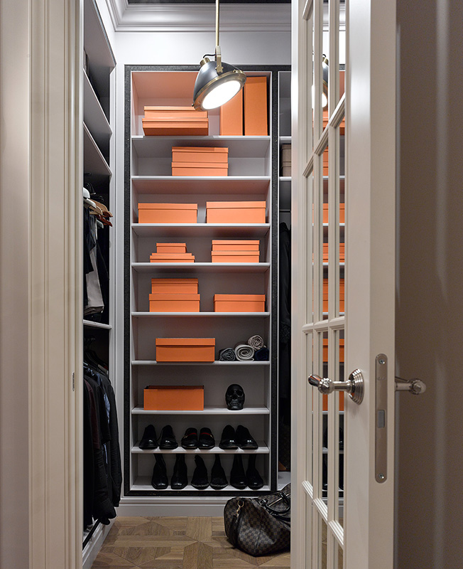 Гардеробная хозяина. Столярные изделия — компания Loft Point. Подвесной светильник Robert Abbey.