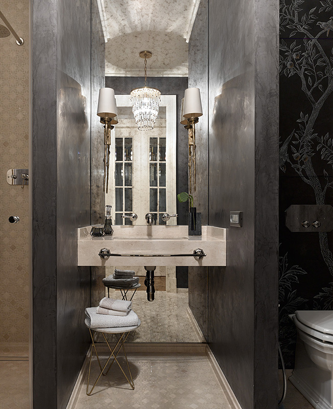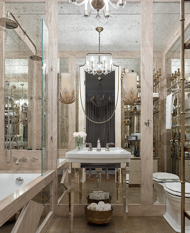Ванная комната. Раковина с консолью Sbordoni. Стеллаж изготовлен по эскизам дизайнеров. Люстра и бра Visual Comfort. Зеркало Vaughan, Berrington. Мрамор Beige Wood.