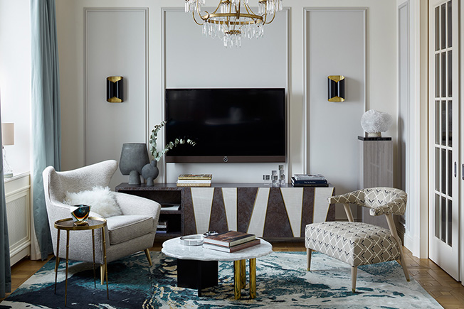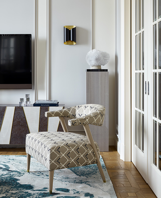 Зона гостиной. Кресло Munna (ткань S. Harris). Тумба под ТВ изготовлена по эскизам дизайнеров. Ковер Tapis Rouge. Скульптура на пьедестале — Pia Maria Raeder, Sea Anemone 5 (Galerie BSL). Бра Visual Comfort.