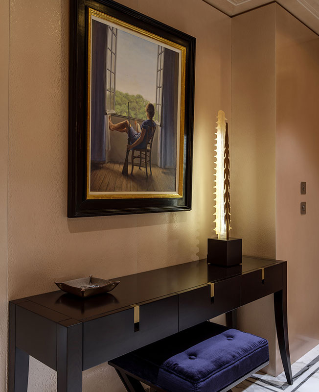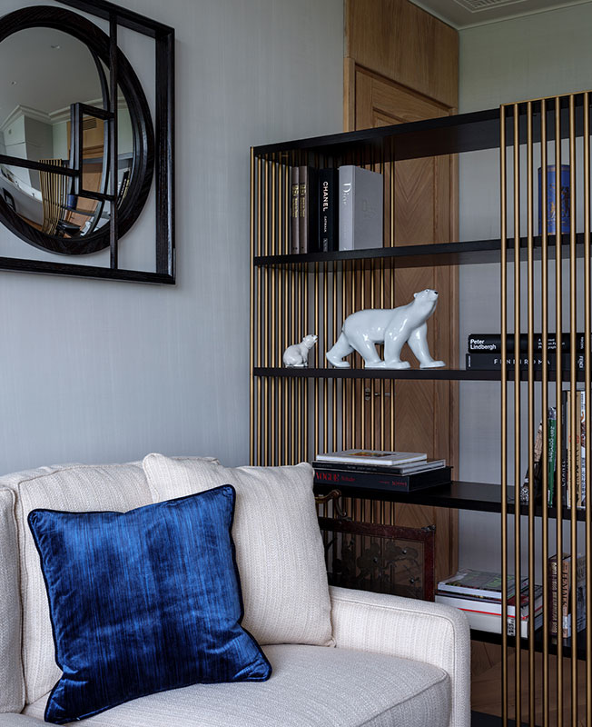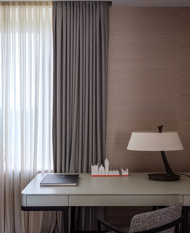 Пространство построено на контрастах теплых и холодных оттенков, матовых и глянцевых поверхностей, различных фактур. В интерьере использована древесина дуба, венге, матовый никель и латунь, а также разнообразный текстиль: бархат, шелк, лен, шерсть и др.
