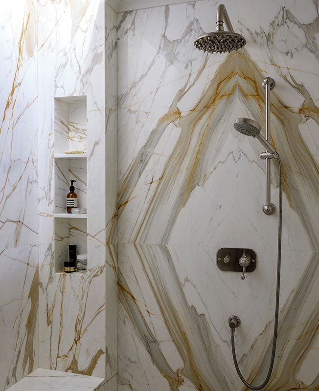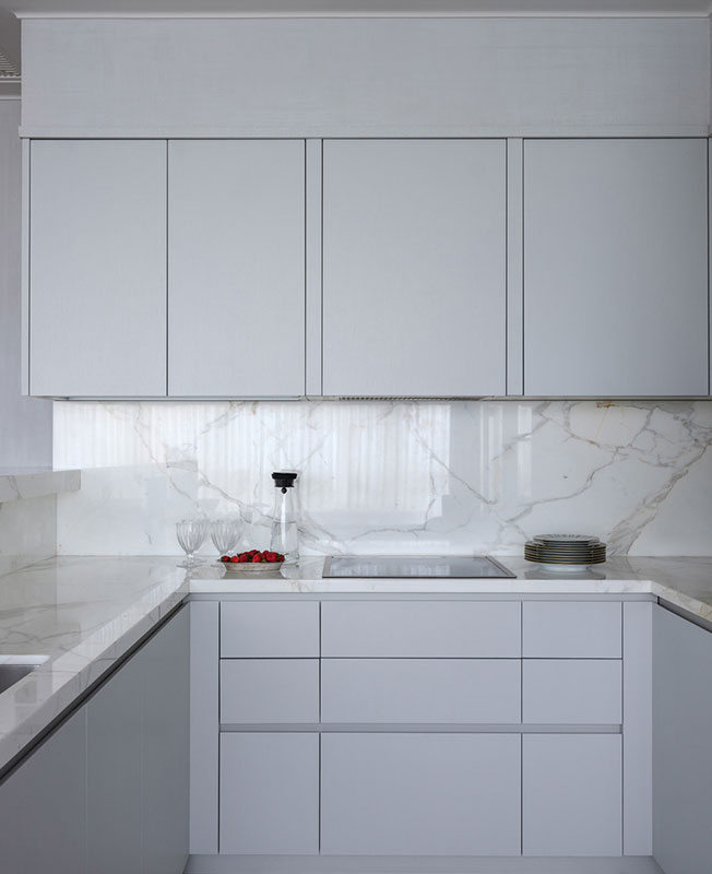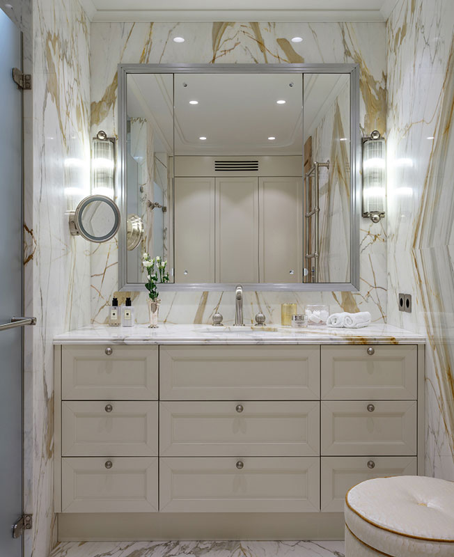 В результате полной перепланировки дизайнеру удалось создать в квартире объединенную кухню-гостиную, три спальни и три санузла (один из них с постирочной), отделенную от приватных зон прихожую и гардеробную 18 кв. метров.