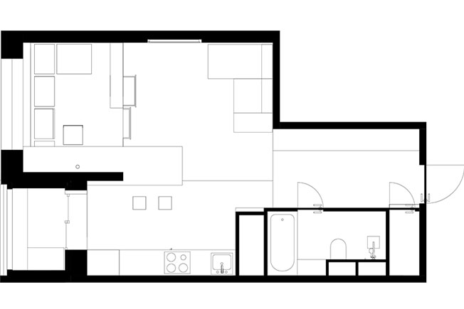 Владелец квартиры 40 кв. метров в новостройке хотел сохранить пространство открытым, не загромождать его дополнительными стенами и дверями. Также все функции — кухню, гостиную, спальню и рабочее место необходимо было оборудовать в одном помещении, но с грамотным зонированием.