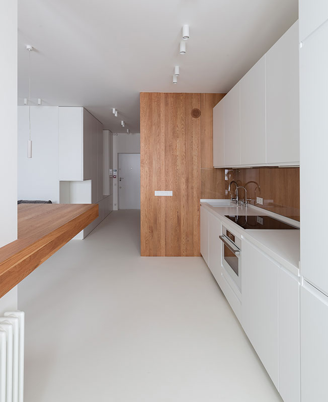 Перед студией стояла задача выдержать строгую палитру. Основой стал белый — цвет, расширяющий пространство и отражающий солнечный свет. При этом натуральная древесина на нейтральном фоне смотрится очень выразительно.