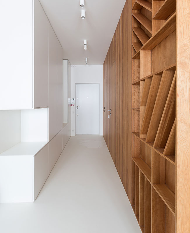 Все встроенные места для хранения органично вписаны в пространство — белый шкаф в прихожей от Mr.Doors и стеллажи, интегрированные в деревянные объемы. Также для хранения одежды в квартире предусмотрена гардеробная. Вся мебель спроектирована по чертежам студии Ruetemple, в том числе лаконичная кухня производства «Стильные кухни».