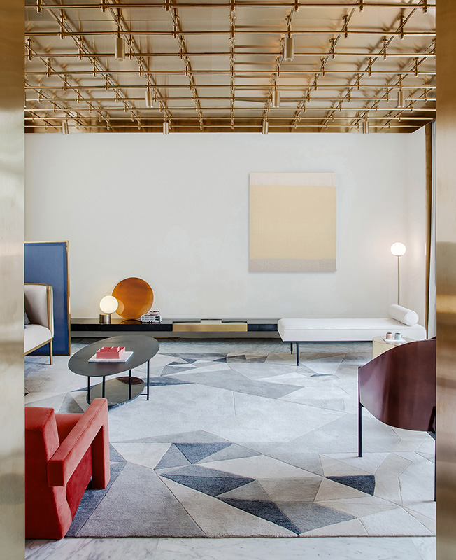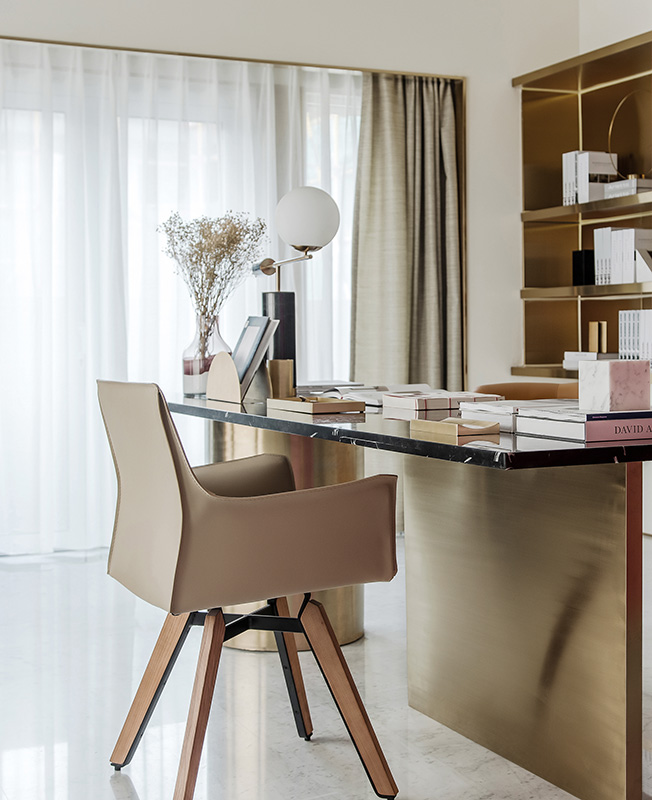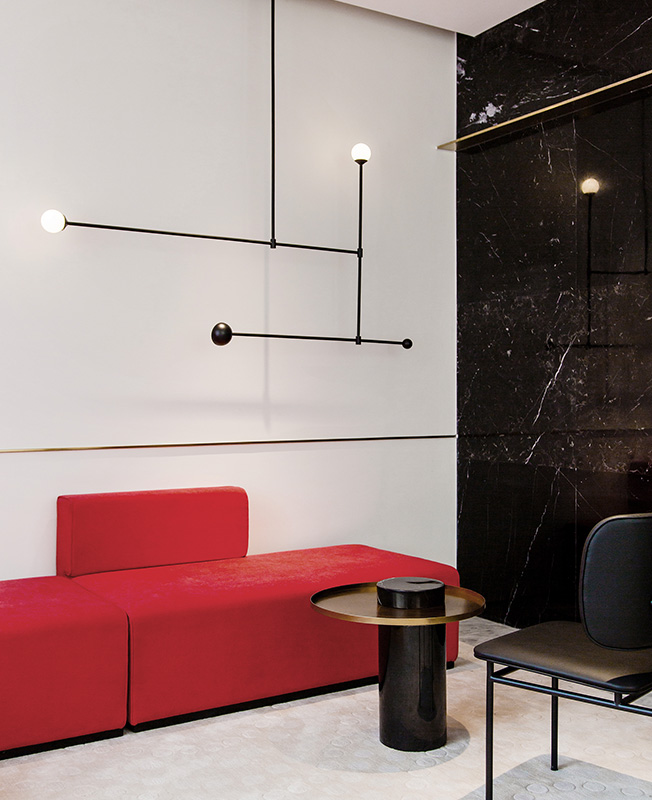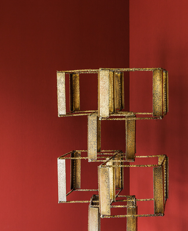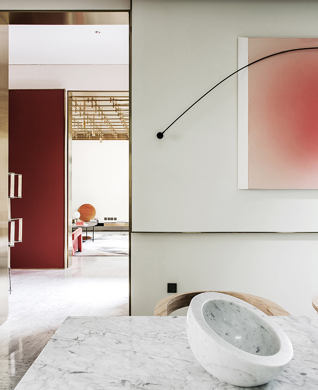 Золотой — один из основных цветов в палитре проекта. Его уравновешивают черный, белый и красный и их оттенки, которые дизайнеры по-разному дозируют в пространствах. В фойе, разделяющем столовую и гостиную, преобладают красный и золотой, чтобы создать величественное ощущение, которое усиливает геометричная скульптура.