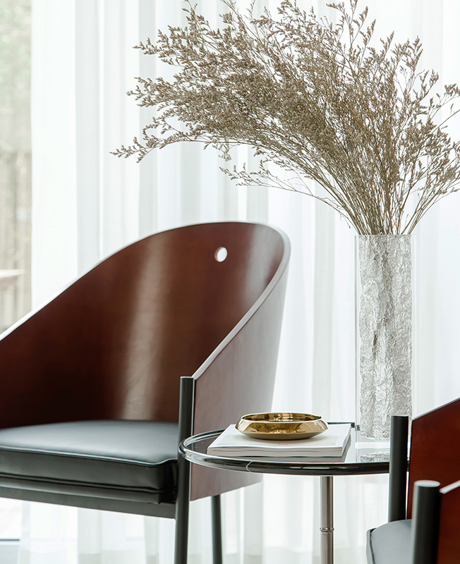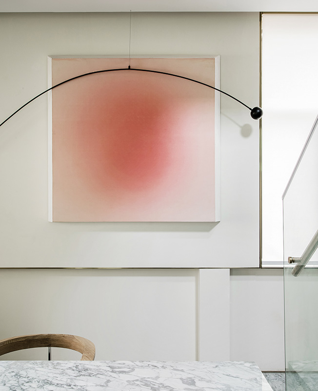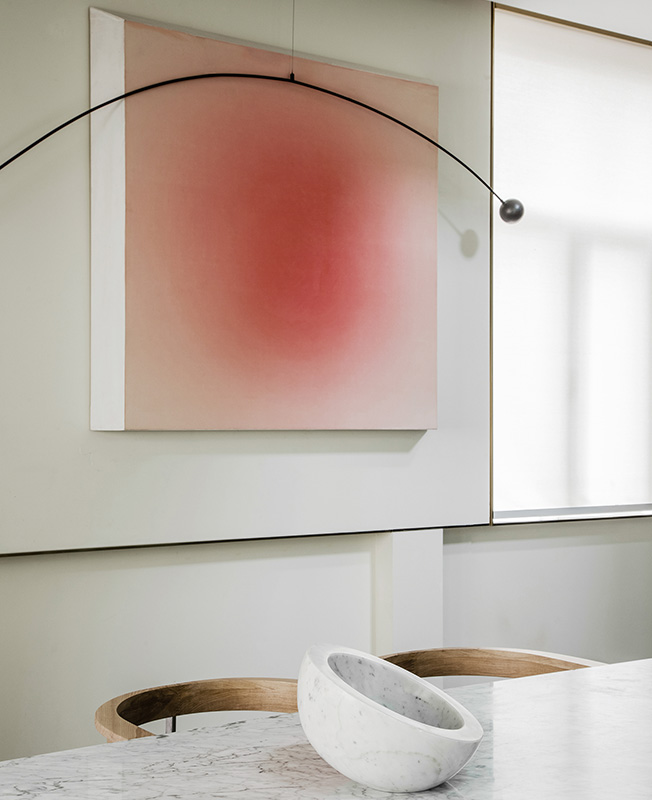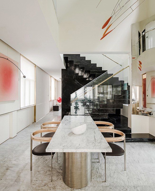 В столовой строгие черный и белый цвета служат нейтральным фоном для ярких красных акцентов. Ванная комната, роскошная и медитативная, отделана черным мрамором. Пространство визуально увеличивает зеркало шириной во всю стену.