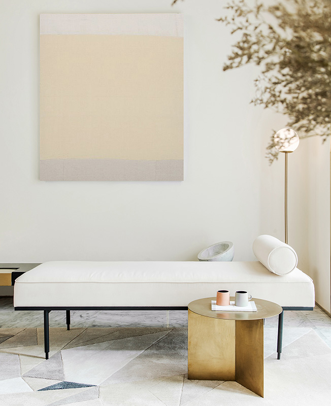 Просторная гостиная впечатляет эффектным потолком из бронзированной нержавеющей стали: на золотистом фоне — такая же золотая решетка, в которую встроена система освещения. Теплый металл с мягким блеском активно используется в интерьере: в оформлении дверных откосов и оконных рам, в элементах мебели и аксессуарах.