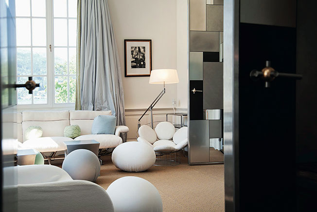 Австрийский замок, пожалуй, самая удачная работа американско-французского декоратора. Порой Кутюрье грешит перегруженностью, скученностью ярких самодостаточных вещей. Но здесь выдержал меру. Даже там, где вещи стоят плотно, например в гостиной, есть воздух — его создают кресла и диваны нейтральных форм в белых обивках. Лейтмотивом проходят по дому элементы из стали и прозрачного пластика — рамы, панно, столы, консоли. Они призваны подчеркнуть: перед нами современный интерьер.