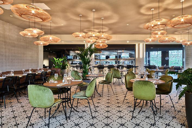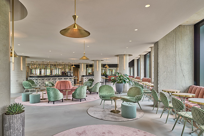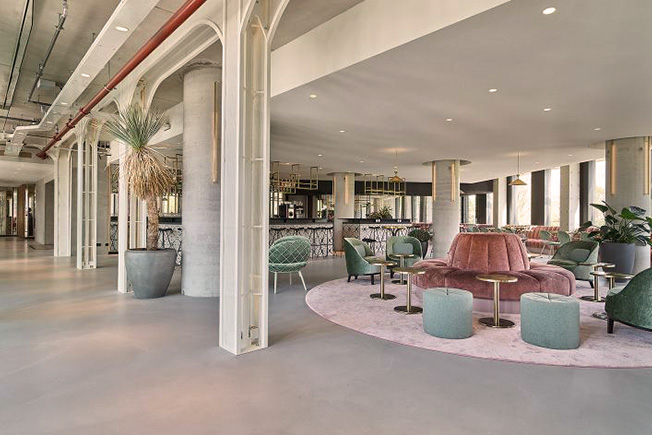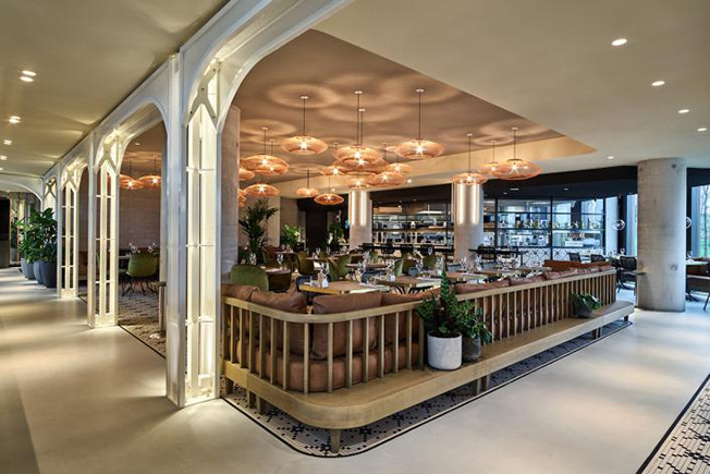 Первое впечатление поражает воображение из-за лобби с трехуровневыми потолками, подвесной лестницей и удлиненным овальным баром. За ним скрывается ресторан Persijn, который отражает принципы шеф-повара Александра Брауэра и современное развитие голландской кухни. В пыльно-зеленом с золотом интерьере ресторана присутствуют такие детали, как мозаика из крошечных черно-белых плиток, вдохновленная национальной вышивкой.