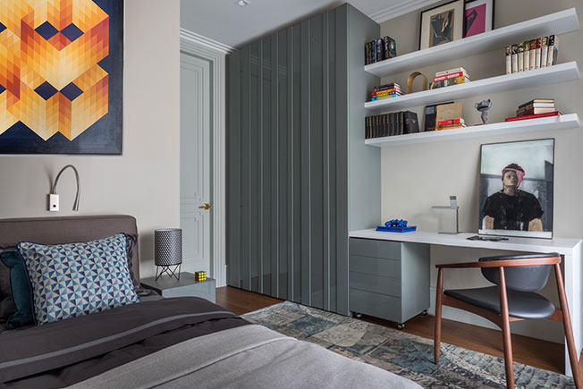 Комната сына решена в более сдержанной «взрослой» палитре, по выбору хозяина спальни. Выразительным акцентом помещения стало панно с ломаными линиями на одной из стен.