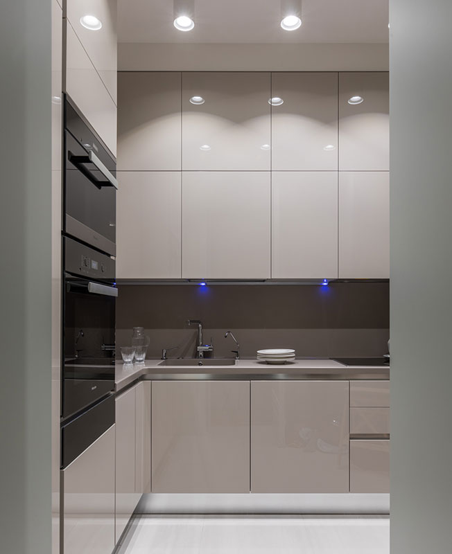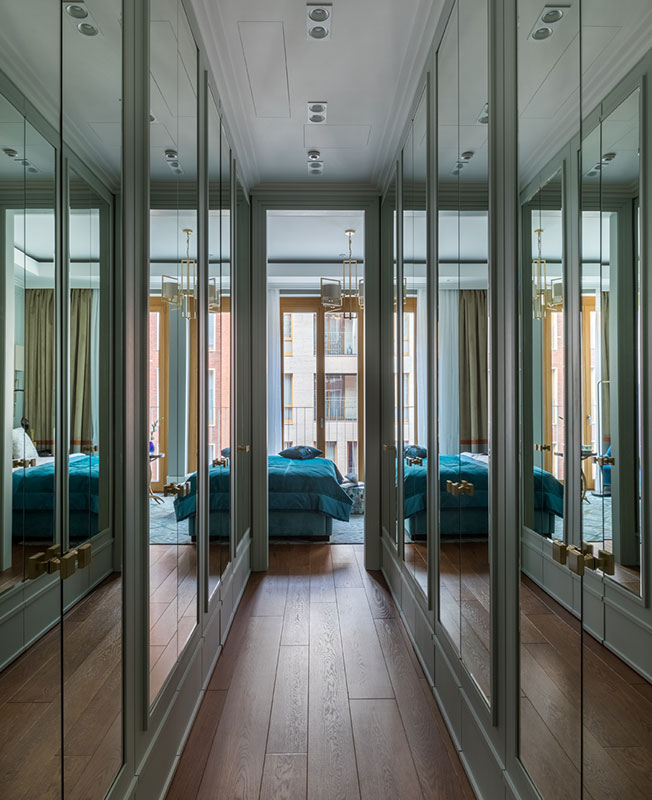 Особое внимание Анна уделила созданию вместительных систем хранения. В квартире была оборудована гардеробная с ярким освещением и многочисленными зеркалами, скрытые шкафы, а в спальне за одной из створок разместилось компактное рабочее место, которое невозможно заметить непосвященному человеку.