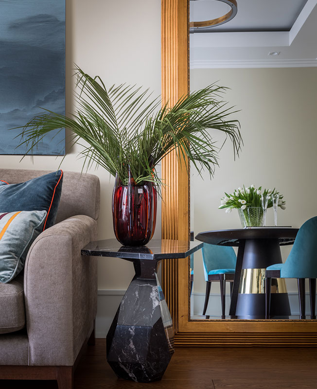 Дизайнер и заказчица достигли полного взаимопонимания буквально на первой встрече, что добавило свободы и легкости в творческий процесс. «Основой колористического решения интерьера стала одна картина, которую мы увидели вдвоем с заказчицей в галерее — на ней удивительным образом совпали все любимые цвета хозяйки. Мягкие серые оттенки гармонично соединили с бирюзой, цветом морской волны и освежающим мятным», — рассказывает Анна Рудакова.