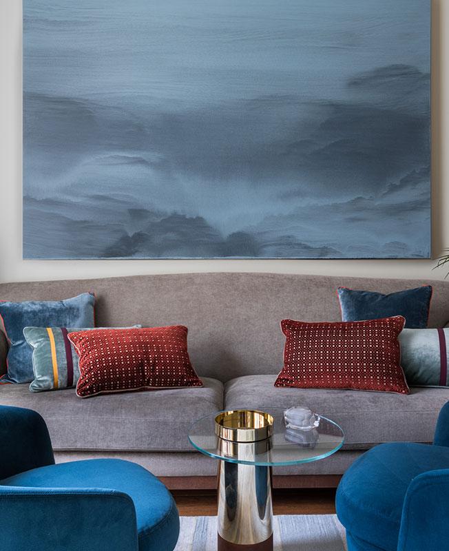 Гостиная. Диван, Marie's Corner, Alto Design. Журнальный столик, Dantone Home. Зеркальная тумба, Porada. Кресла, Minotti. Картина над тумбой, Федор Махонин (собственность заказчицы). Картина над диваном, Luis Coquenao, Booroom Gallery.