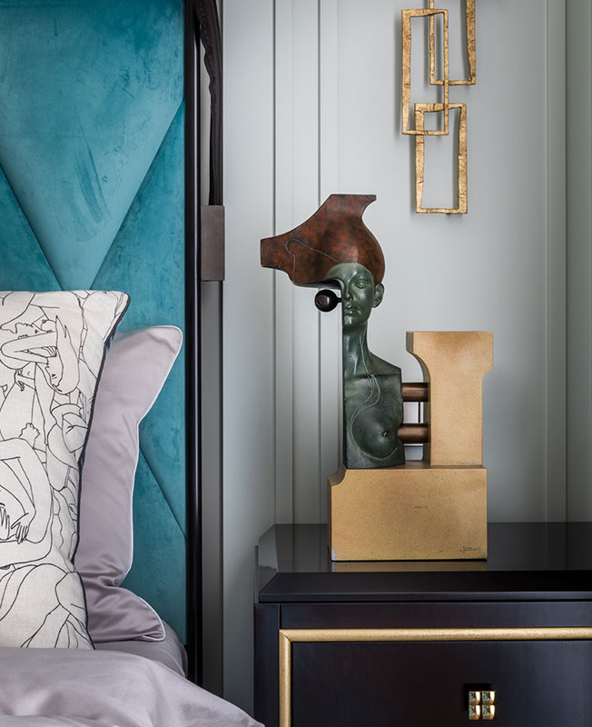 Спальня. Кровать выполнена по эскизам дизайнера, Алиандр Групп; текстильная обивка, Kravet, Kado. Панно, Inkiostro Bianco, Декоративные подушки, Enere. Картина, Jaro Zibzibadze, Art Brut Moscow.