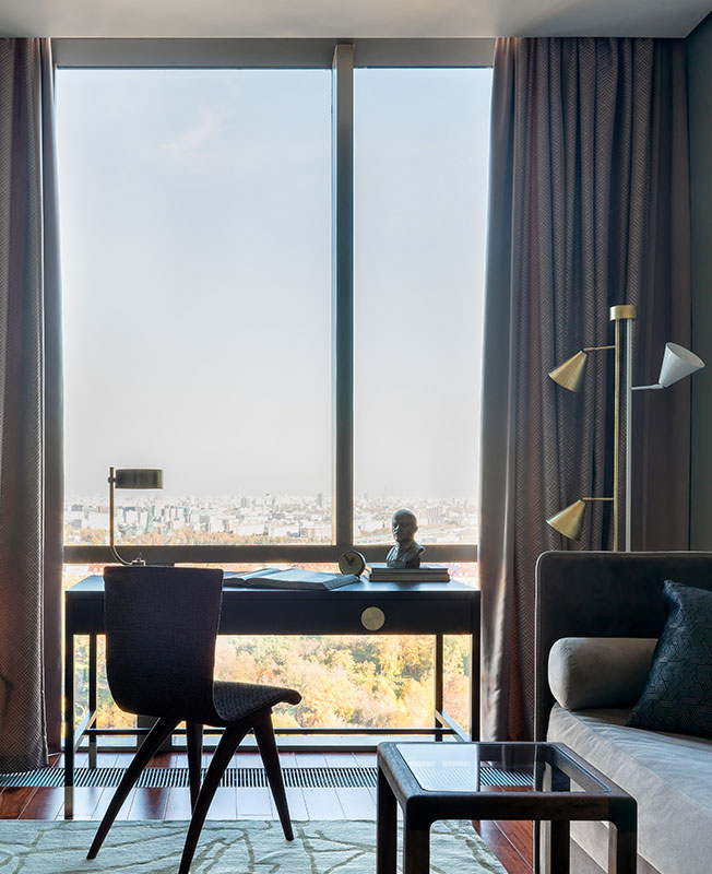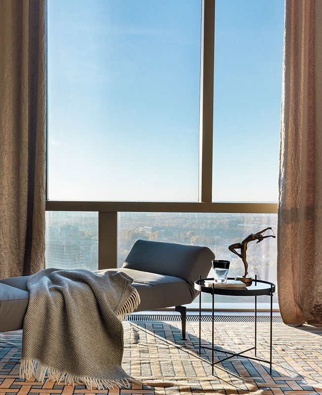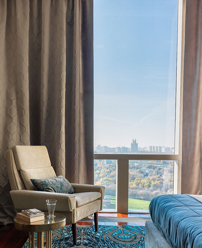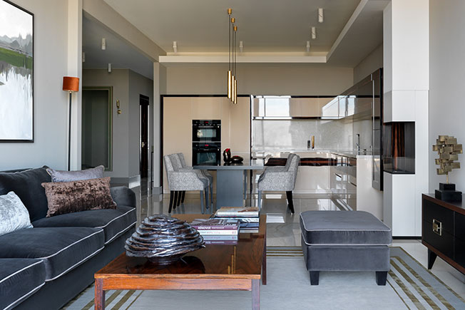 Заказчикам нравится ар-деко. Однако эта стилистика в ее традиционной версии вступала в конфликт с архитектурой. Дизайнер убедила хозяев найти более современный вариант: «Мы старались избегать прямолинейных ассоциаций с эпохой и расставили акценты на фактурах и материалах. Основная идея проекта: создать гармоничное пространство в стенах небоскреба».
